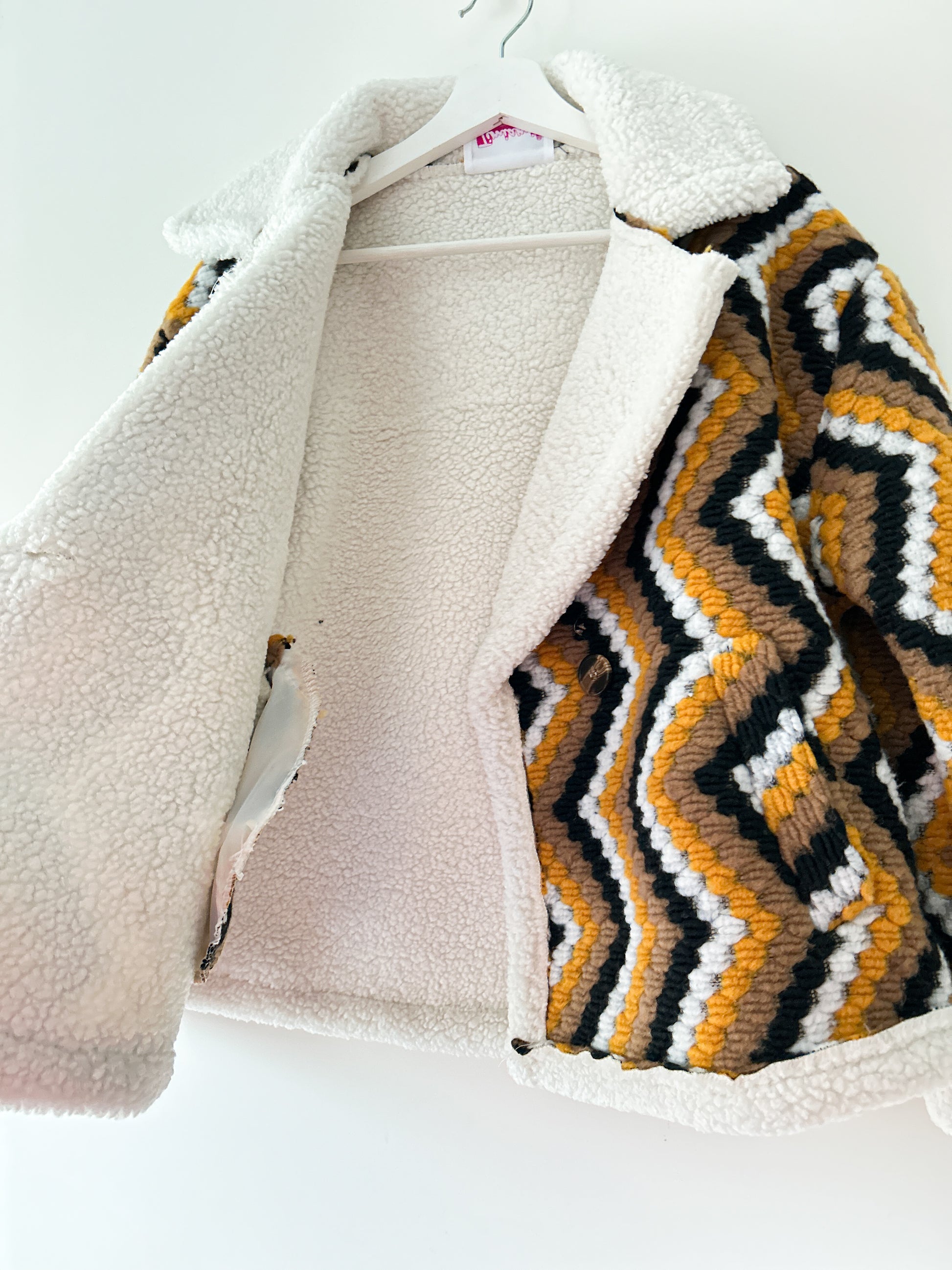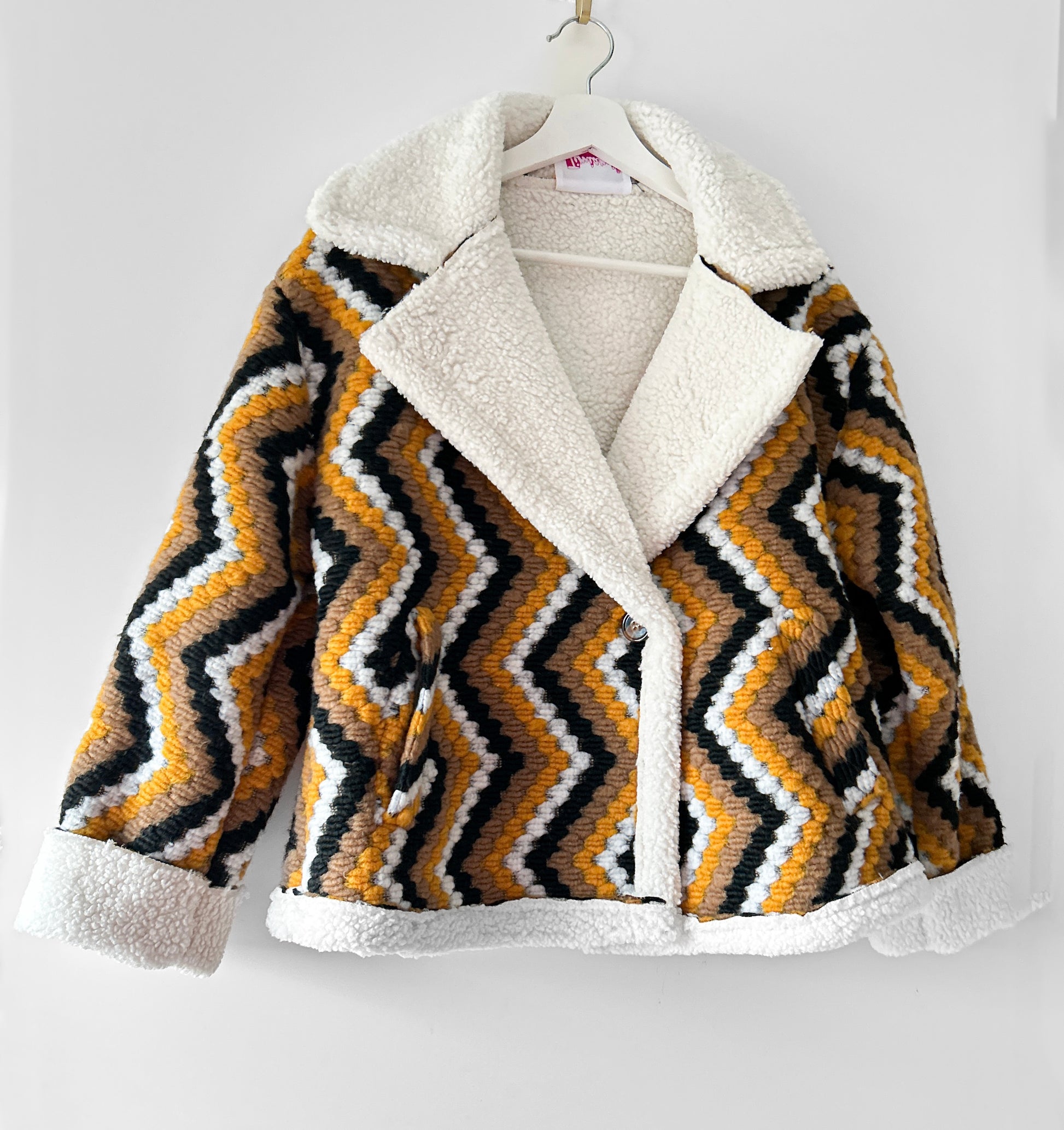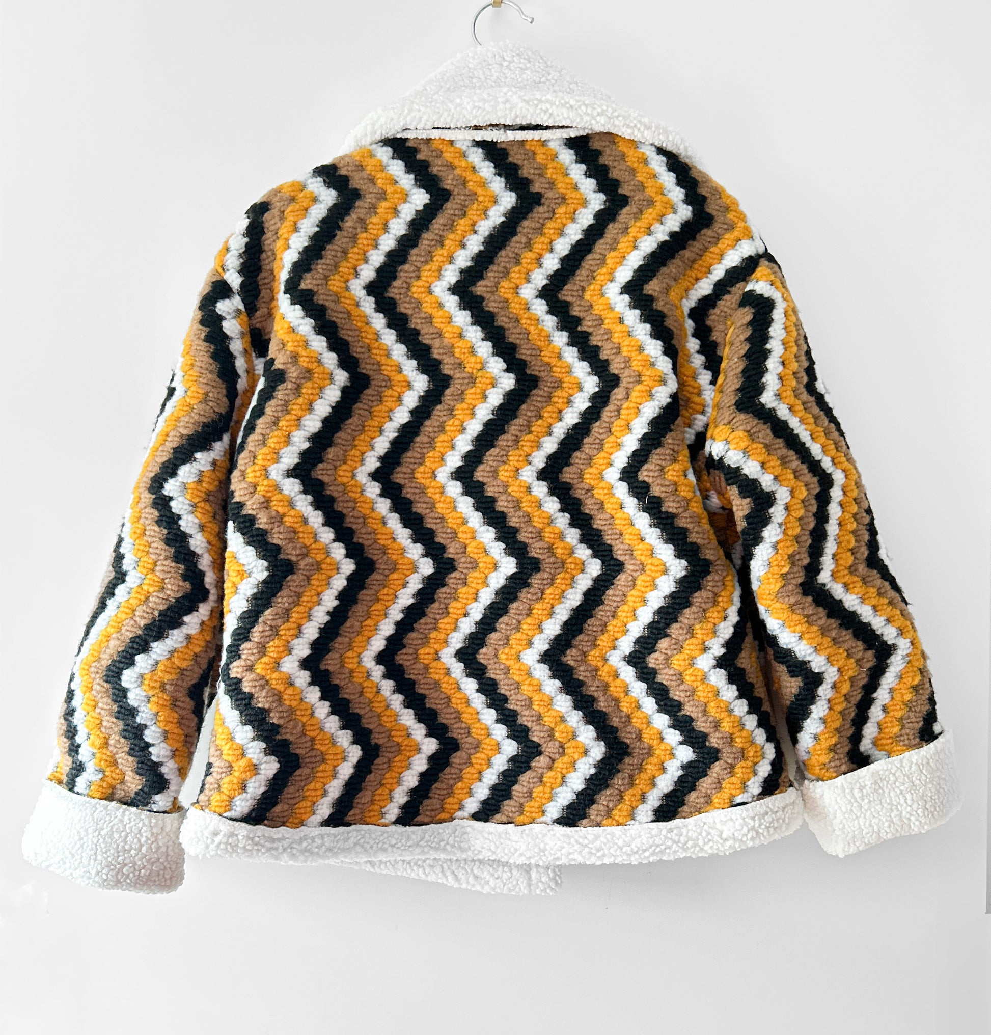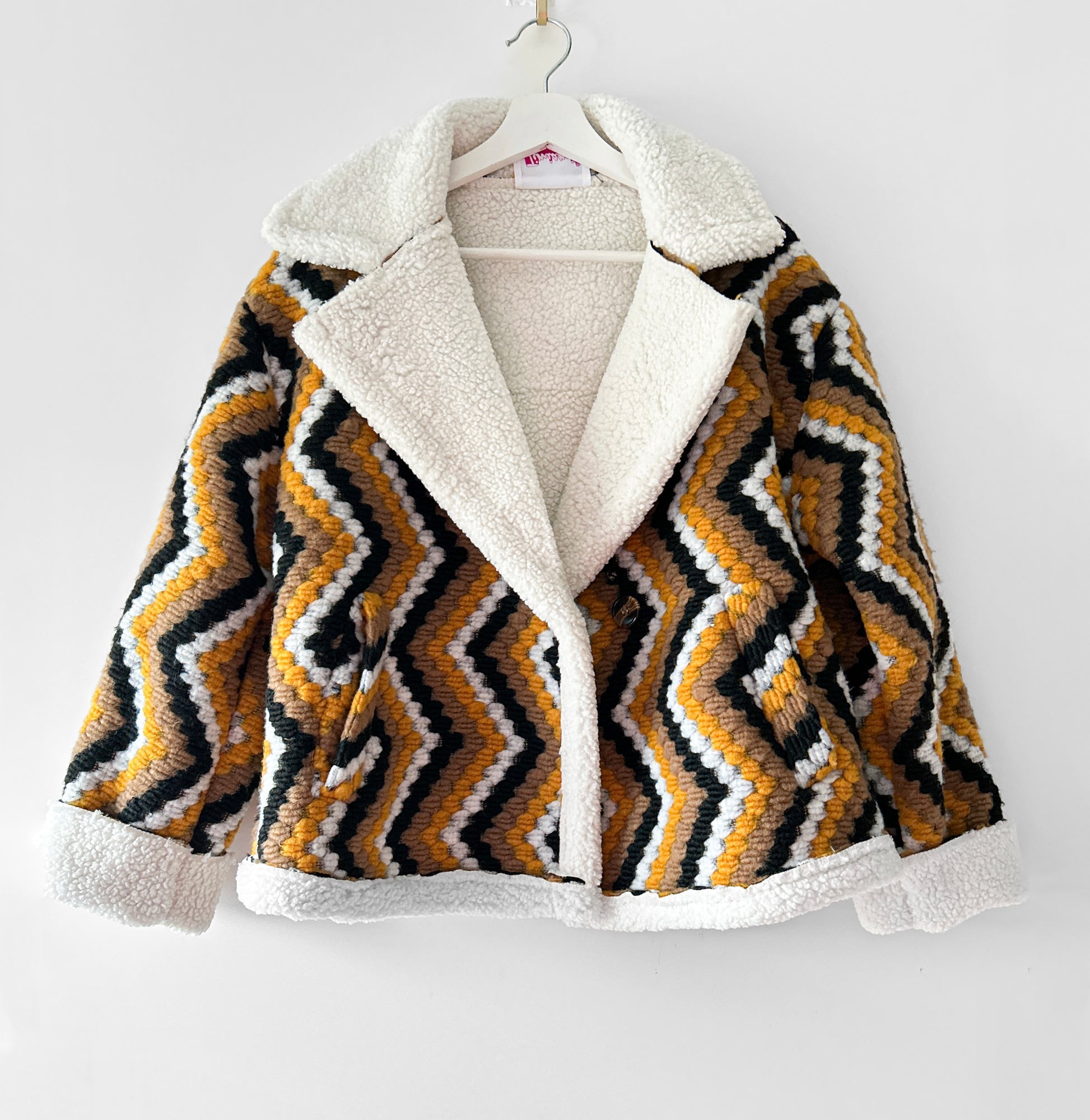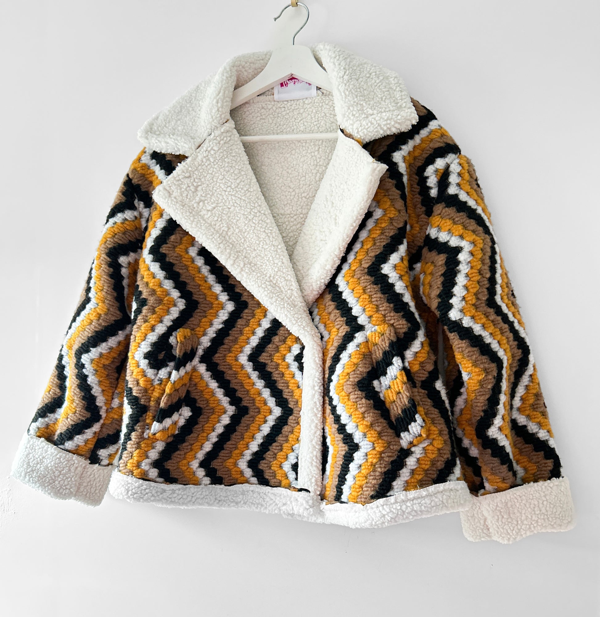 Echt een eye-catcher! Prachtige volle jas met reliëf en zigzag motief. Bewerkt met 30% wol, dus heerlijk warm. Hij heeft zakken en je kan hem sluiten met een grote knoop. Er kan nog een dikke wintertrui onder. One Size (36 t/m 42), valt ruim.